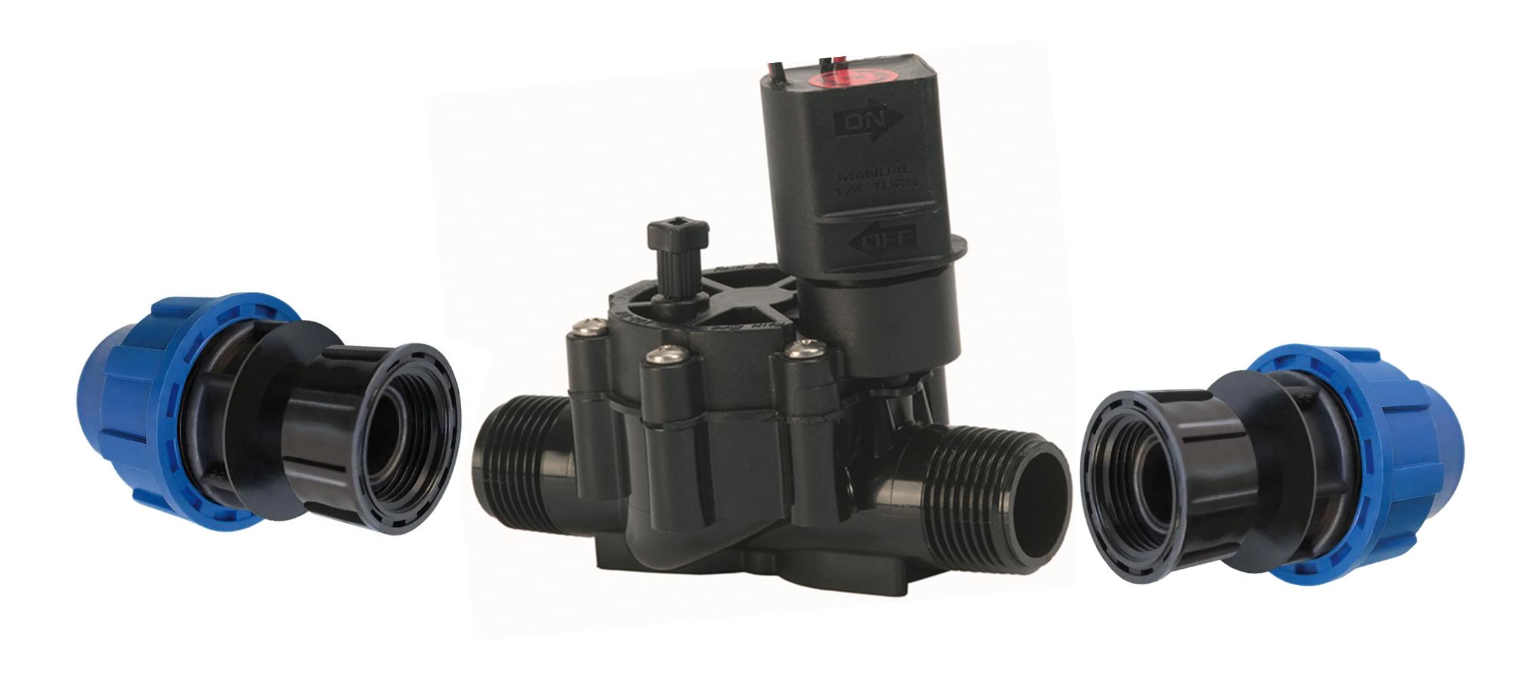 Magnetventil 100-DV-MM 24VAC + 2 Stück PE-Kupplung 25 x 1" IG Überwurf (PN16 mit fixiertem O-Ring)