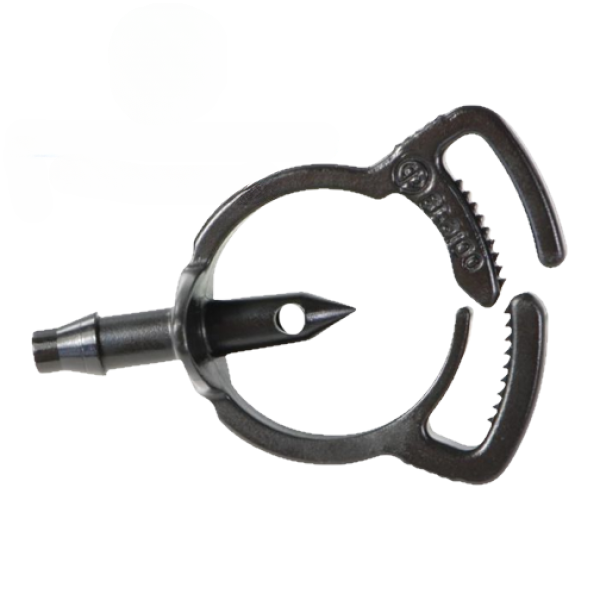 Kunststoff-Schelle mit Stachelanschluss (Miroschlauchabgang) Profi Rohrbefestigungsschelle mit Microabgang, alternative zu SPB-025 für 16 - 18 mm PE-Rohr, Abgang: 4,5 mm Tülle
